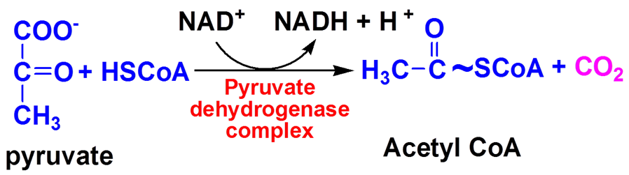 ② 丙酮酸的氧化脱羧:丙酮酸脱氢酶复合体