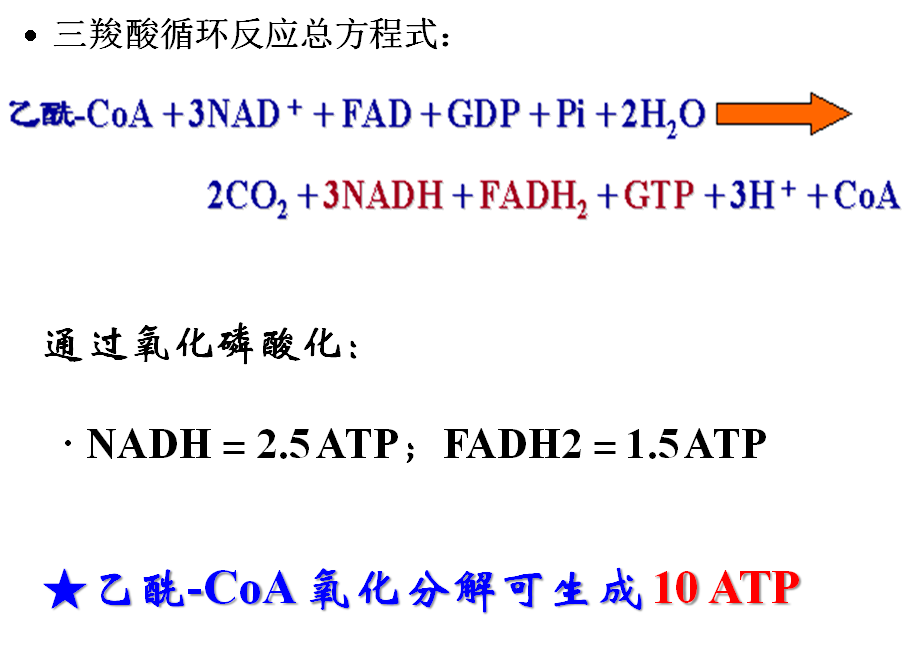 · 在线粒体,乙酰-CoA通过三羧酸循环分解为CO2 ,同时生成 NADH 等