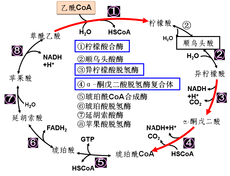 ③三羧酸循环:异柠檬酸脱氢酶、α-酮戊二酸脱氢酶复合体。柠檬酸合酶