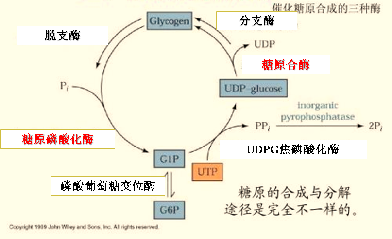 1.糖原合成酶不能从头合成糖原,需要至少四个葡萄糖残基的引物。
