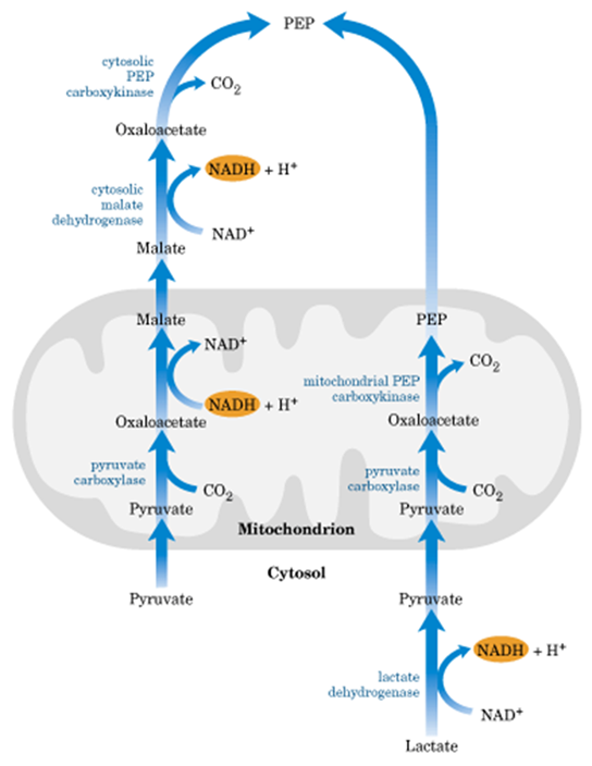 当乳酸进行糖异生时,可生成 NADH,不需要转运,通过线粒体的磷酸烯醇式丙酮酸羧激酶直接合成 PEP,或通过天冬氨酸转运。