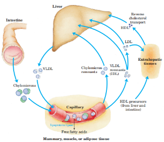 当饮食中含有的脂肪酸超过了作为燃料所需的量时,或者摄入过量的碳水化合物,它们就会转化为肝脏中的甘油三脂,还有一些胆固醇和胆固醇酯, 并与特定的载脂蛋白apoB-100和apoE包装成VLDL。入血后从HDL获得apoC,在血液中从肝脏运输到肌肉和脂肪组织,apoC-II激活LPL从VLDL中的TG释放游离脂肪酸。在脂肪细胞吸收这些脂肪酸,将其转化为TG,储存在细胞内的脂滴中;而在肌细胞主要氧化脂肪酸以提供能量。VLDL表面的apoC、PL和Ch转移给HDL,HDL中的CE转移至VLDL,同时随着TG不断被水解,生成IDL。IDL的载脂蛋白主要是apoB-100和apoE,大约50%被肝细胞膜受体识别结合摄取。另外50%IDL的TG被进一步水解耗尽,apoE也转移给HDL,核心只剩下CE,转变为LDL。