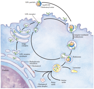 LDL中胆固醇酯非常丰富,含有apoB-100作为主要的载脂蛋白,LDL将胆固醇携带到具有特定质膜的肝外组织中识别apoB-100的受体,主要通过LDL受体介导的途径被摄取。游离的Ch可以被纳入细胞膜中,也可以被ACAT重新酯化储存在胞浆脂滴内。在肾上腺和性腺可以作为合成类固醇激素的前体。如果摄取过多,可以抑制HMG-CoA还原酶,减少细胞内Ch的合成;从转录水平抑制LDL-受体的表达,减少细胞摄取LDL。
