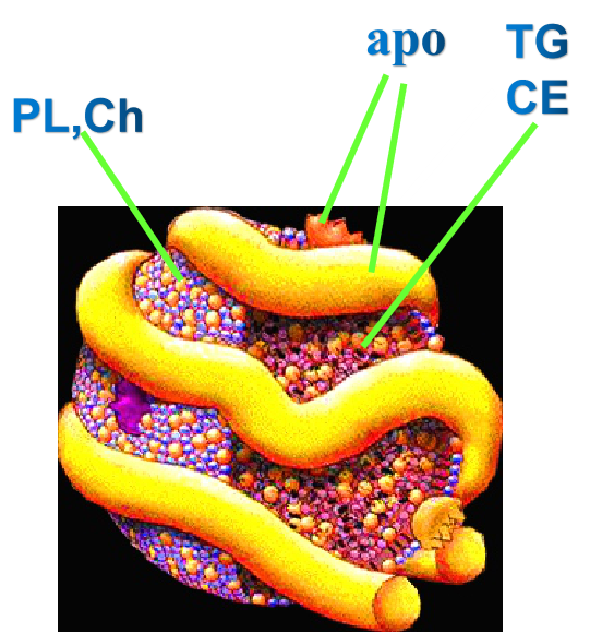 小肠粘膜细胞利用食物消化吸收来的脂类物质(中长链脂肪酸),通过MG途径再次合成TG,并与PL、Ch,加上apoB-48(这类脂蛋白所特有的)和apoA组装成新生的CM。经淋巴循环入血,从HDL中获得apoE和apoC而成熟。apoC-II激活脂肪、心脏、骨骼肌和哺乳乳腺组织毛细血管中的脂蛋白脂肪酶,使游离脂肪酸释放到这些组织中。 因此,CM将膳食脂肪酸运到组织中,作为燃料消耗或储存。核心TG被耗尽,表面apoA、apoC及PL、Ch离开CM形成新生的HDL。但仍然含有胆固醇脂、apoE和apoB-48,称为乳糜微粒残粒。通过血循环运输到肝脏,被肝细胞表面受体识别结合,并通过内吞介导其摄取。正常人CM在血浆中代谢迅速。