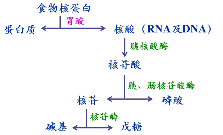 体内来源主要是自身合成。食物来源核酸以核蛋白形式存在,碱基主要被分解而排出体外。