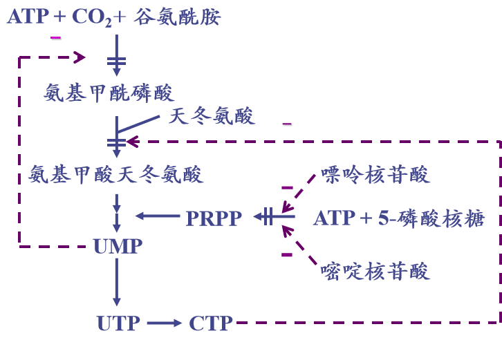 2.调节:哺乳动物关键酶CPS-2,UMP为其别构抑制剂;核苷酸产物反馈抑制PRPP合成酶。