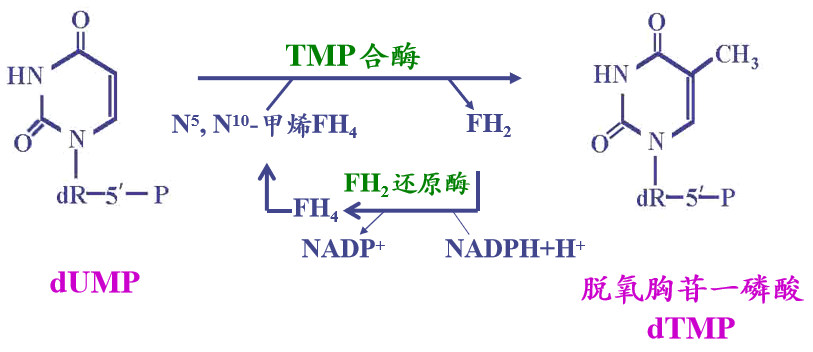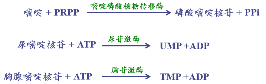 三个阶段:(1)UMP的生成;(2)CTP的生成;(3)dTMP的生成