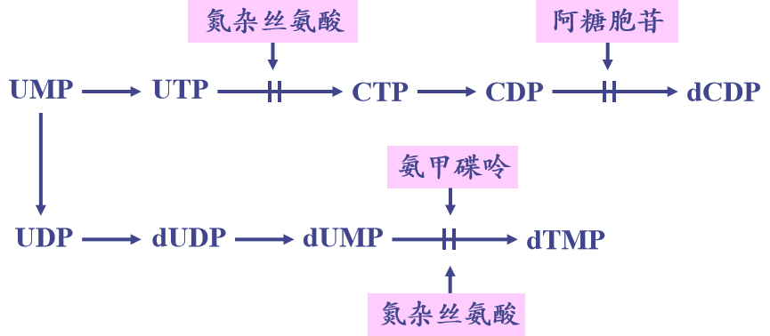 5-氟尿嘧啶 | 氮杂丝氨酸等 | 甲氨蝶呤等 | 阿糖胞苷、环胞苷等 |