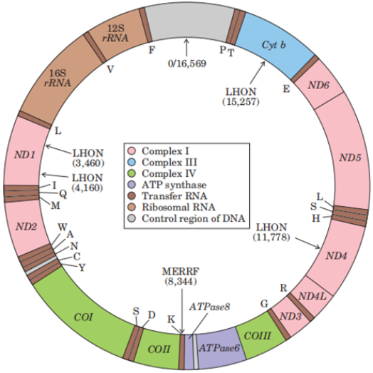 线粒体基因组编码37个基因,包括13个编码呼吸链多酶体系的一些多肽的基因、22个编码mt-tRNA的基因、2个编码mt-rRNA(16S和12S)的基因。