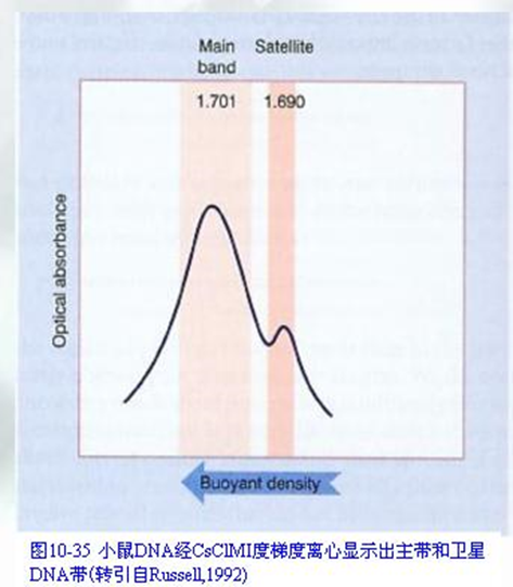 2.卫星DNA(satellite DNA)主要存在于染色体的着丝粒区,重复单位一般由2~10 bp组成,成串排列,在人基因组中约占10%。