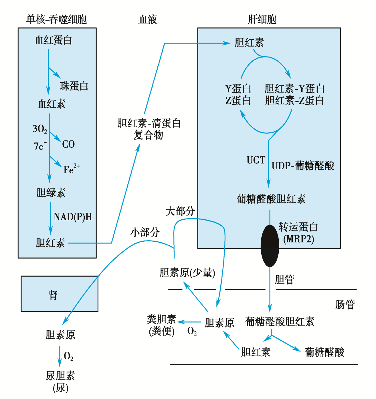 到肝脏后,与配体蛋白(Y蛋白或Z蛋白, 以Y蛋白为主 ) 结合,至滑面内质网生成葡糖醛酸胆红素,即结合胆红素,与重氮试剂直接反应,也称为直接胆红素。分泌进入胆管系统,随胆汁排入小肠。