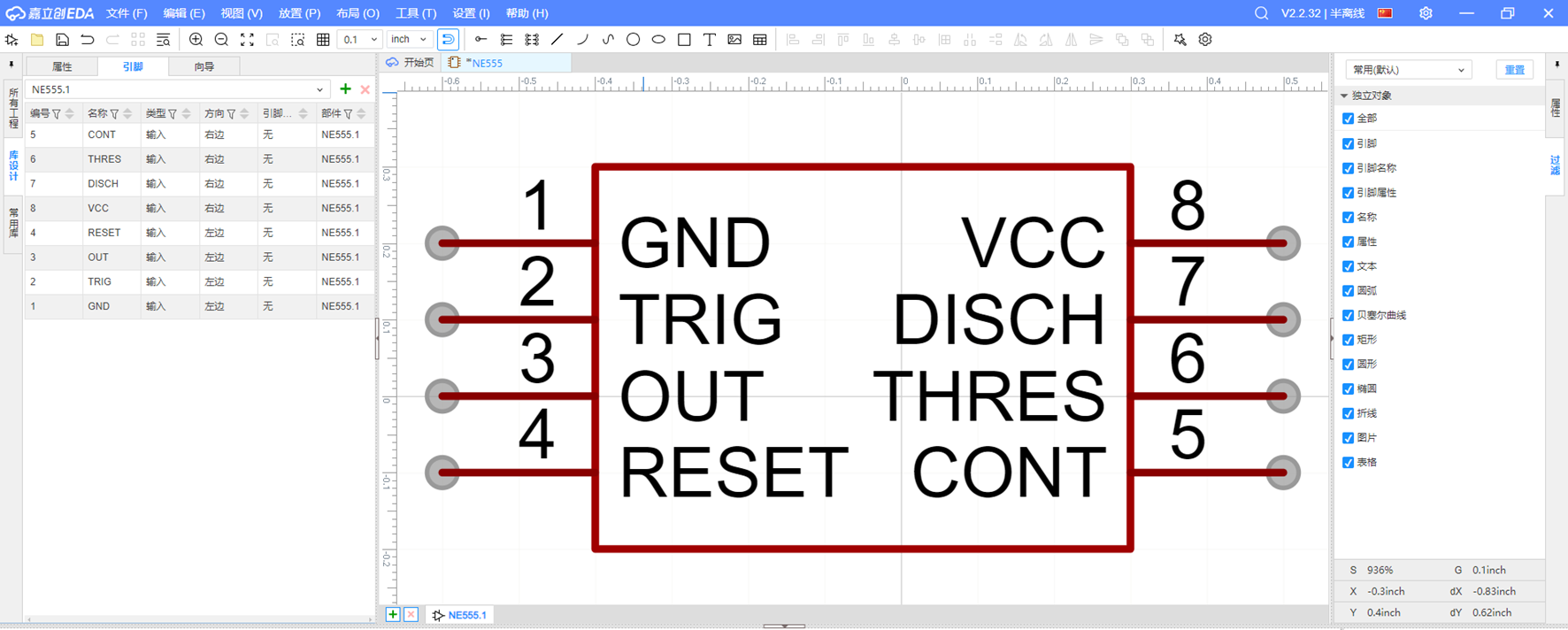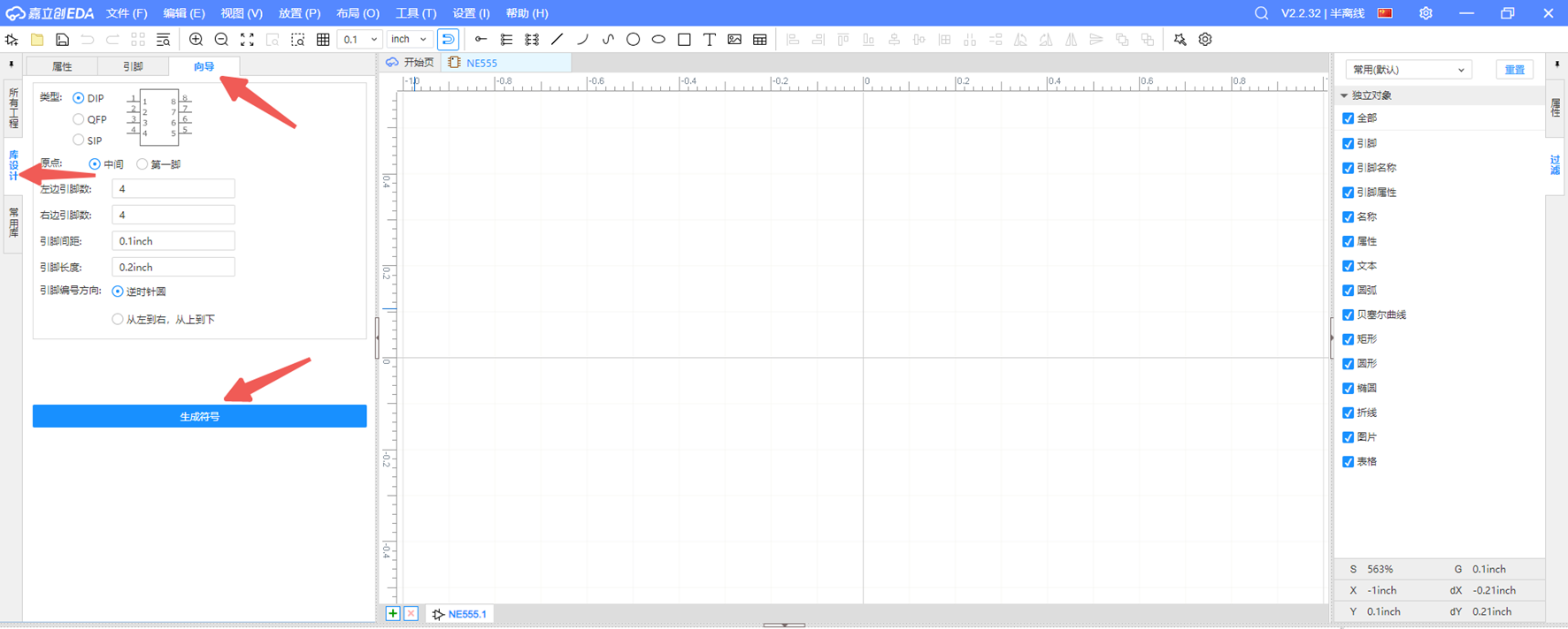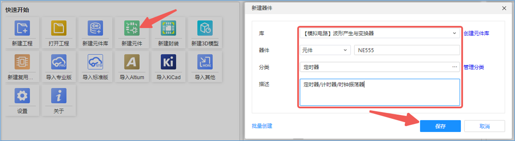 嘉立创EDA(专业版)支持符号向导功能快速生成符号,这里,以NE555定时器符号为例进行演示。在快速开始预览卡片里,点击“新建”元件按钮,在弹出“新建器件”窗口中,可以下拉选择为元件类型。填写输入元件名称为NE555,选择元件分类,添加描述信息等,然后“点击保存”,完成创建。