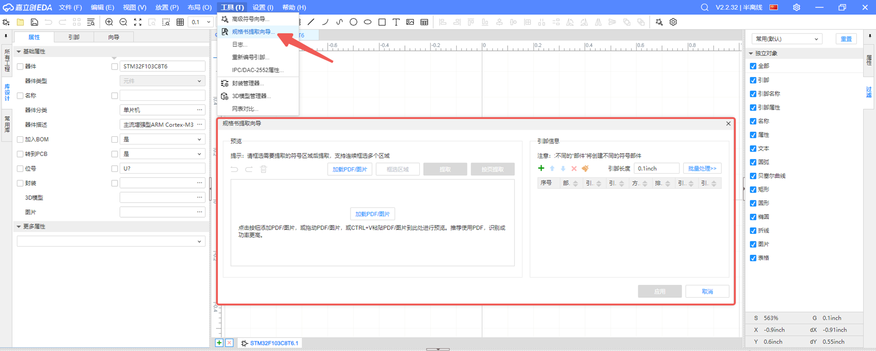 规格书提取向导可以用于快速创建IC类型芯片的符号,只需要用户在向导中加载PDF或图片,然后识别出符号的引脚信息,方便快速创建符号。推荐采用粘贴图片的形式导入加载,会更加方便使用操作。