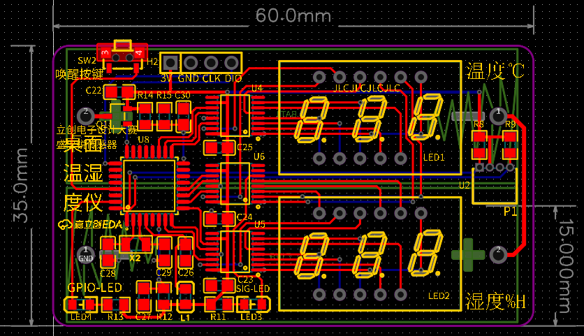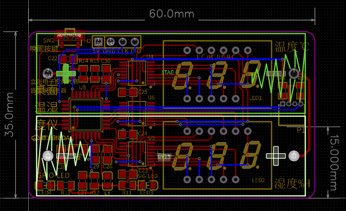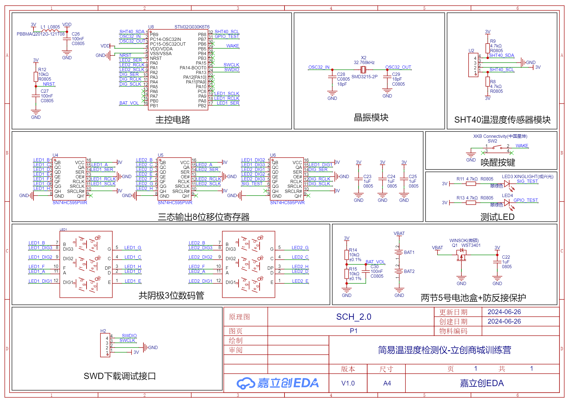 桌面温湿度检测仪通过SHT40检测室内温湿度,通过两个3位共阴极数码管显示数据,整体使用两节5号电池进行供电,非触发时处于休眠状态,预计使用时长6个月。