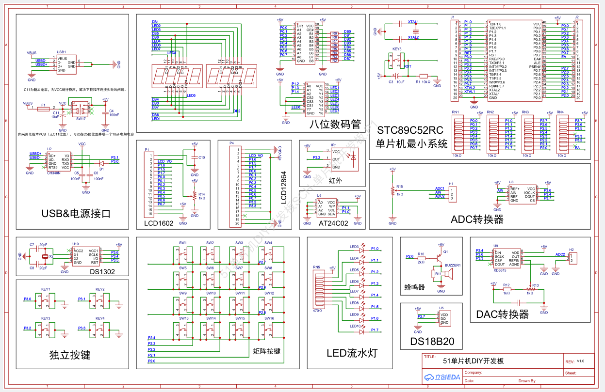 请根据原理图PDF文件,创建工程,命名为“学号-姓名”,绘制原理图,并布线。要求将图中的所有电阻、电容及LED的封装改为贴片。