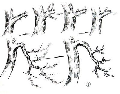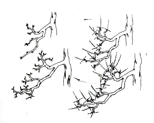4、在主干两肩等高着生的扁担枝,应去一留一。在分枝过少不便疏去时,应以一抑一扬或转换伸展角度等手法扭变其位,以免呆板。