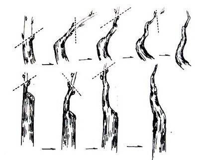 5、疏:又叫疏剪,是将一年生或多年生枝条从基部剪去。疏剪对全桩起削弱作用,减少树体总生长量。它对剪口以下枝条有促进作用,对剪口以上枝有削弱作用,这种作用与被剪去枝的粗细有关。适当的疏枝可以改善光照条件,有利于树冠内的枝条健壮生长和花芽分化。