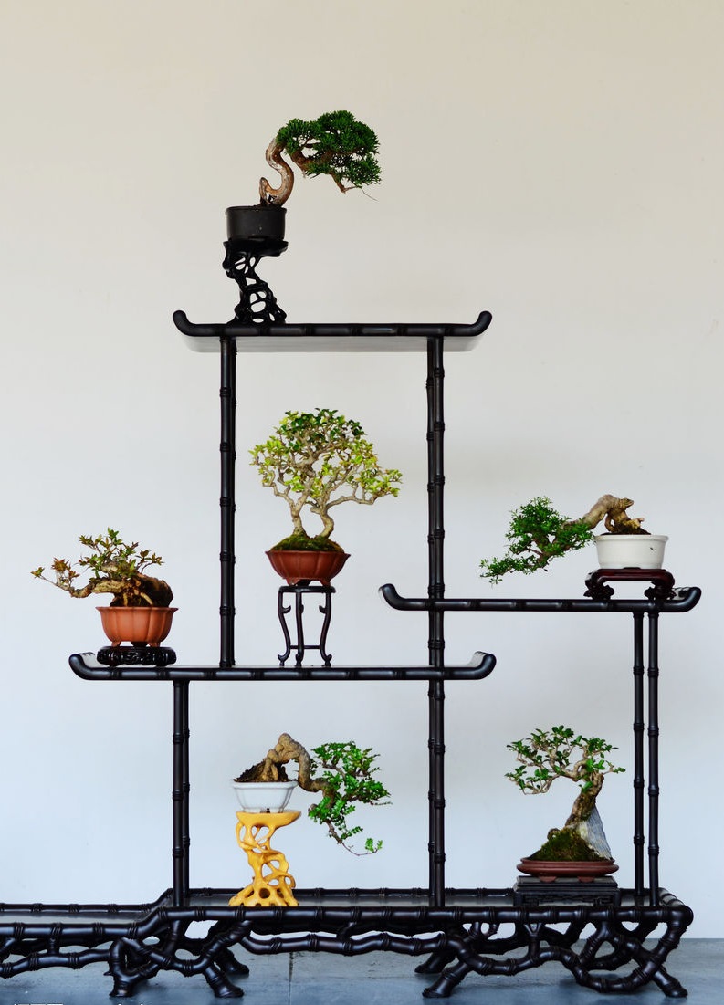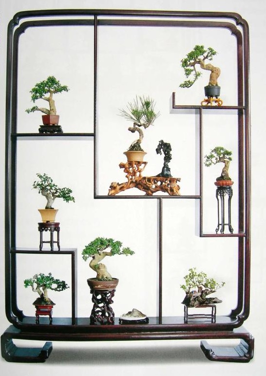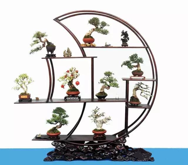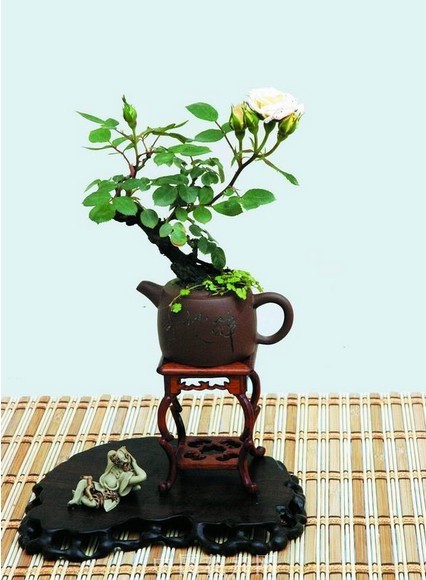(4)配盆:上盆定植时,还要根据树形姿态配上相宜的盆钵,以增强其艺术效果。一般情况下,高深的签筒盆适合于悬崖、半悬崖式;腰圆或浅长方盆,栽植直干或斜干;圆形成海棠形盆,宜配干身弯而低矮的植株,多边形浅盆宜植高干植株,使上面着生细枝,呈现柔枝蔓条、扶疏低垂之态,显得格调高雅、飘逸。
