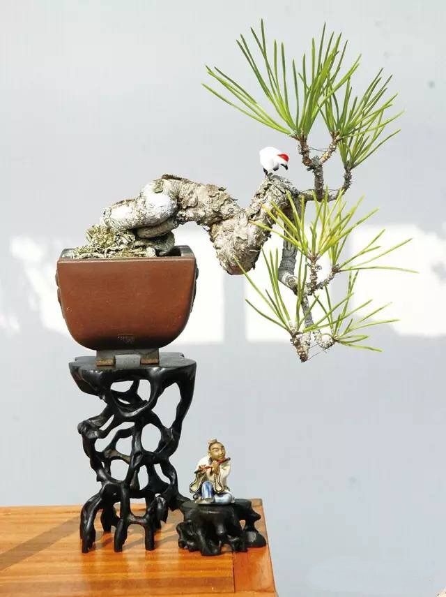 (2)枝丛造型:枝叶不宜过繁,否则地上地下失去平衡,应以简练,流畅为主,以达到形神兼备,充分显示自然美。对那些不必要的杂乱枝条,都应除去或实行短截、变形。蟠扎枝条时,要根据原有形态而设计构思,然后适当地作画龙点睛式的加工。