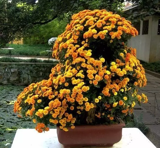 (3)悬崖临水式:当苗根从筒盆底部生出时,用加肥培养土把筒盆套埋于直径25—30cm的瓦盆中,入土深度3—4cm,起初筒盆、瓦盆一起浇水,以后逐渐过渡到只浇水于瓦盆中,不浇筒盆。在管理过程中逐步对小菊地上部整形成悬崖式,直至花蕾透色时方打开筒盆,冲净根上泥土,挂在山石或其它造景位置上,使其下端根须浸入水中,以示悬崖临水之意。
