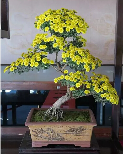 小菊盆景是以草本植物表现千年古树的苍劲峻美之态,其造型是从育苗开始的。