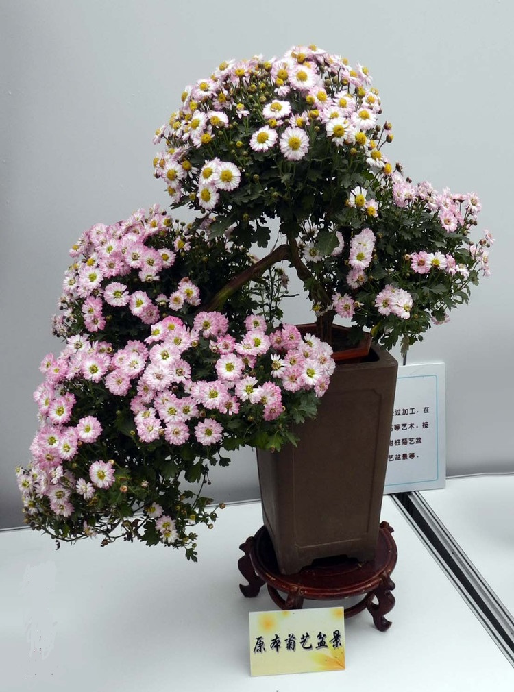 (2)石附式和木附式:采用浅瓦盆,根据石、木的形状,配备适当株形、花色菊苗。石附式以纹理好、吸水性强的石料为佳。也可根据立意、构思选用其它石料。