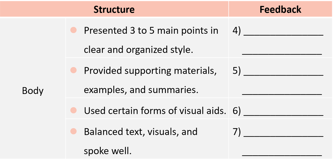 An effective approach is to start with a main point and then back it up with data and evidence. After you present your main point, the audience can evaluate your reasoning and logic with the progress of your presentation. Provide a short summary before moving on to a new point and use transitional language to link points, so as to make it easierfor the audience to understand the development of your argument. The following signposting language may be used to guide your audience:
