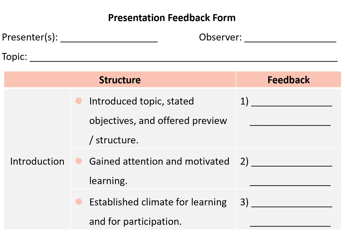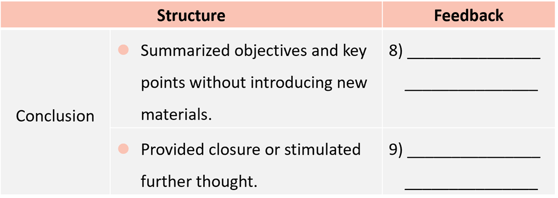 When you have finished answering questions, you can thank the audience for their questions and then summarize once again the main point(s) that your presentation is designed to communicate. When possible, ask members of your audience for constructive feedback on your presentation. Listen to what they say and focus on areas that need improvement. Try to see any negative points not as a measure of failure but as learning opportunities for future presentations.