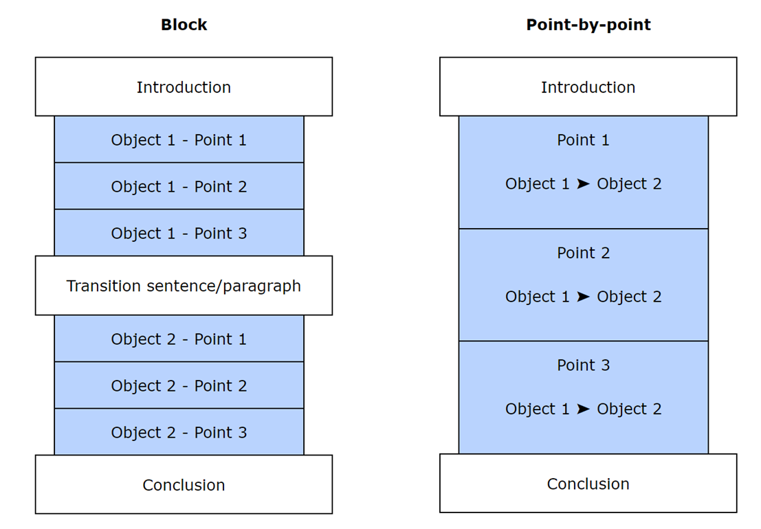 There are two main ways to structure a compare and contrast essay, namely using a block or a point-by-point structure. For the block structure, all of the information about one ofthe objects being compared/contrasted is given first, and all of the information about the other object is listed afterwards. This type of structureis similar to the block structure used for cause and effect and problem-solution essays. For the point-by-point structure,each similarity (or difference) for one object is followed immediately by the similarity (or difference) for the other. Both types of structure have their merits. The former is easier to write, while the latter is generally clearer as it ensures that the similarities/differences are more explicit.