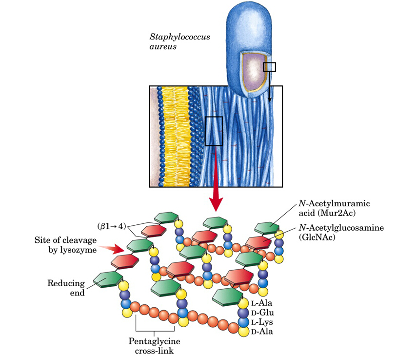 1、肽聚糖(peptidoglycan):一切细菌和蓝藻的细胞壁都含有肽聚糖。