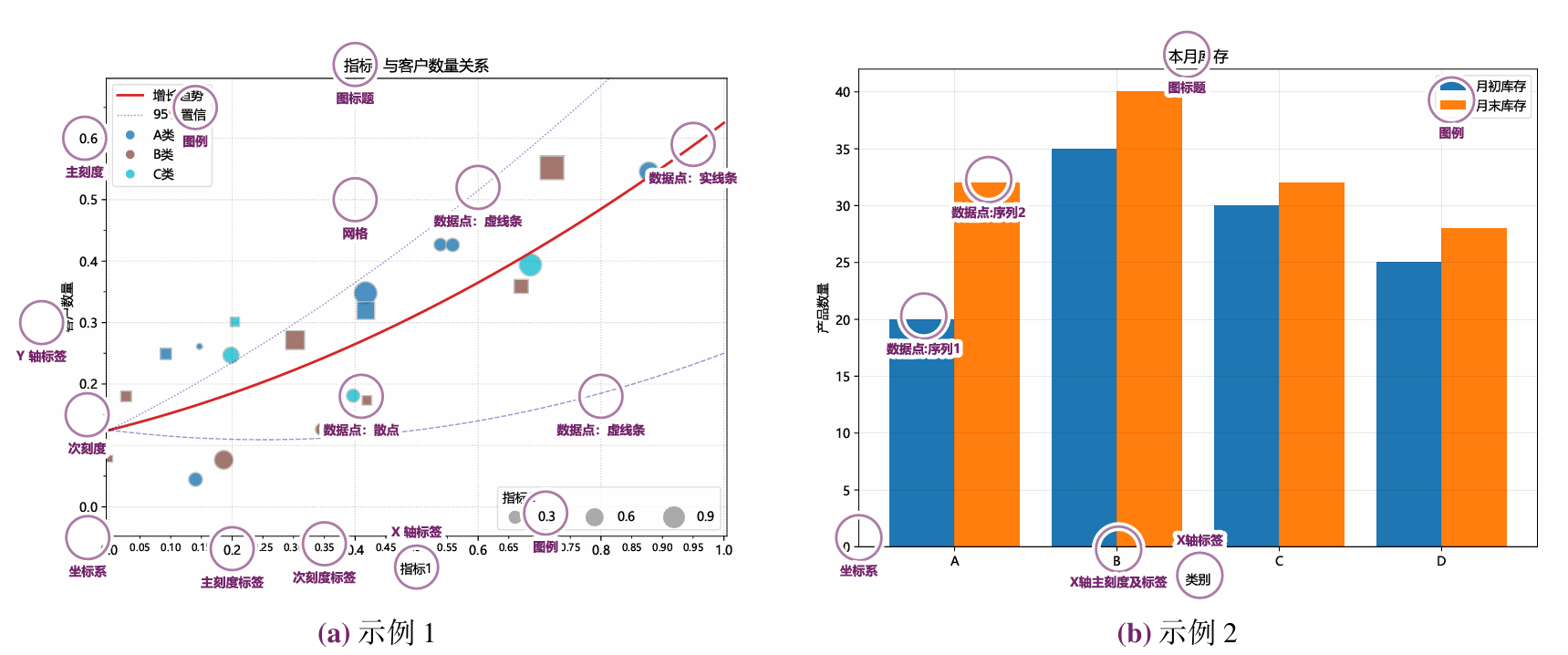 数据图一般主要由坐标轴、数据点、图形元素、标题和图例等部分构成。