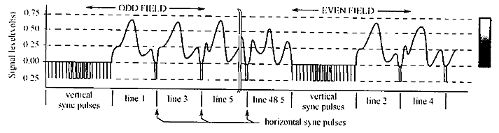 Standard television uses an interlaced format to reduce flicker in the displayed image. This means that all the odd lines of each frame are transmitted first, followed by the even lines. The group of odd lines is called the odd field, and the group of even lines is called the even field. Since each frame consists of two fields,the video signal transmits 60 fields per second. Each field starts with a complex series of vertical sync pulses lasting 1.3 milliseconds. This is followed by either the even or odd lines of video. Each line lasts for 63.5 microseconds,including a 10.2 microsecond horizontal sync pulse,separating one line from the next. Within each line,the analog voltage corresponds to the gray scale of the image,with brighter values being in the direction away from the sync pulses. This place the sync pulses beyond the black range. In video jargon,the sync pulses are said to be blacker than black.