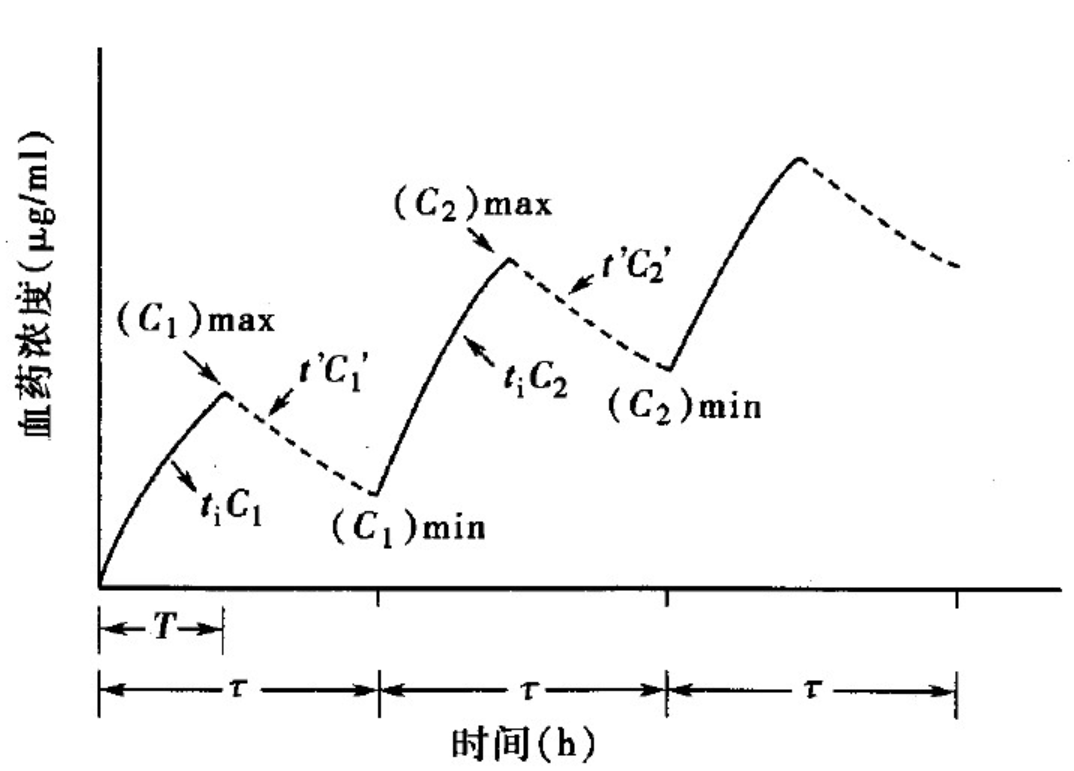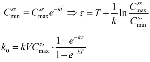 为进行间隙静脉滴注给药方案的而设计,我们需要确定滴注速度k0、给药间隔τ和停止滴注时间t`,给药间隔τ可巧妙的通过稳态最大血药浓度与稳态最小血药浓度的关系式求算出来。