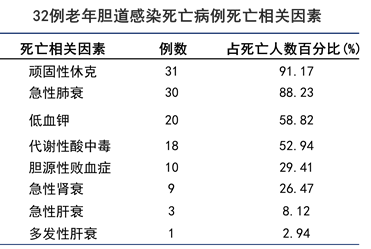 32例胆道感染死亡病例中,有顽固性休克的31例,占所有死亡病例的91.17%;有急性肺衰者30例,占所有死亡病例的88.23%;有急性肾衰者9例,占所有死亡病例的26.47%;有胆源性败血症者10例,占所有死亡病例的29.41%;有急性肝衰的3例,占所有死亡病例的8.82%;有低血钾者20例,占所有死亡病例的58.82%;有代谢性酸中毒者18例,占所有死亡患者的52.95%;多发性肝衰者1例,占所有死亡病例的2.94%。