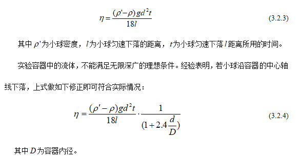 小球在流体中下落时受到三个铅直方向的作用力:小球重力mg、浮力及粘滞阻力F(其方向与小球运动反向)。若流体无限深广,且光滑的刚体小球下落速度v较小情况下,F遵从斯托克斯公式: