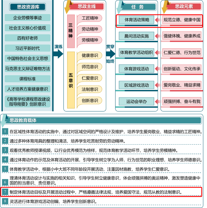 7.法制意识:严格按照幼儿园工作相关法律法规进行体育活动组织实施,培养学生法制意识。
