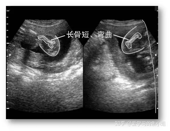 长骨明显缩短或外表异常,可能是骨骼发育不全,短长骨是胎儿宫内生长迟缓的早期警报,肱骨或股骨缩短均与染色体异常的风险增加有关,肱骨在辨识21三体方面更可靠。