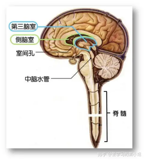 侧脑室位于大脑半球的深部,左、右各一,呈“C”形室腔,内衬室管膜,腔内充满脑脊液。分为中央部、前角、后角、下角,并以室间孔与第三脑室相通。