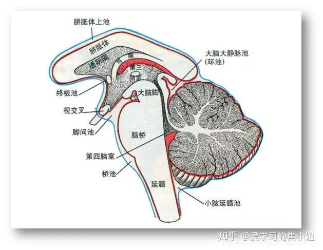 小脑延髓池是小脑和延髓周边的空隙,它分为位于小脑和延髓后表面之间的小脑延髓池和位于小脑和延髓外侧之间的小脑延髓池,中间有脑脊液。