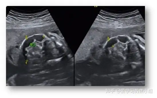 侧脑室扩大:直径10mm以上。轻度脑室扩大(MVM)定义为10至15毫米之间。常有胎儿脑积水的表现。