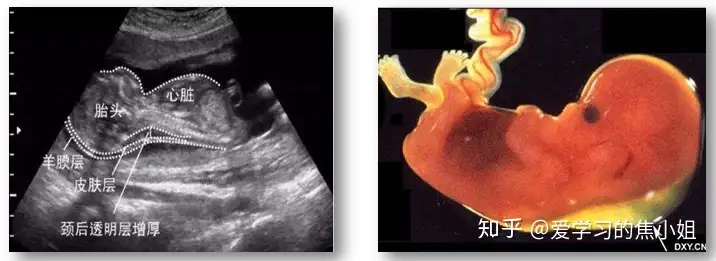 颈部透明度厚度( nuchal translucency ,NT):指胎儿颈椎水平冠状切面皮肤至皮下软组织之间的最大厚度,正常胎儿存在此透明区代表胎儿生理性新陈代谢所产生的液体积存。