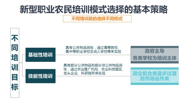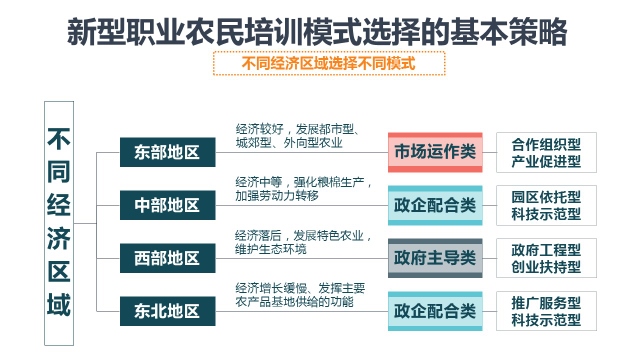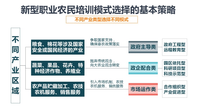 我国新型职业农民培训模式目前以政府主导为主,主要以社会公共产品的形式出现,如果只强调农民培训的社会公益性质,在目前市场竞争环境下,最先进的农业科技就不会很快进入农村和农业领域。因此,要加强新型职业农民培训市场化运作这一薄弱环节,按照市场化要求在投资机制、管理机制、运行机制和评价机制等方面有所创新,创造更好的新型职业农民培训模式以供选择。在模式的选择过程中,切不可搞一刀切,应紧密结合农业产业结构调整和当地特色产业发展,根据农业生产实际以及农业规模产业发展的要求选择培训模式。