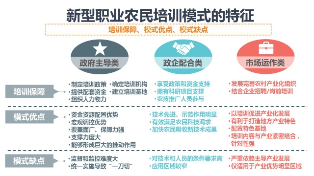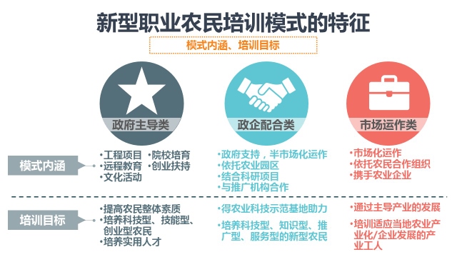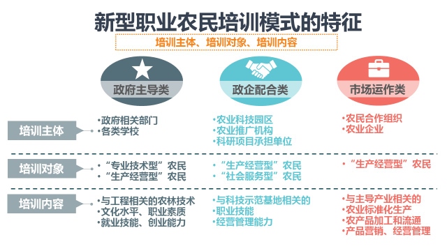 中央和地方财政支持实施新型职业农民培育工程,开展整省、整市和整县示范推进,逐步实现所有农业县市区全覆盖。“十三五”期间,重点实施新型农业经营主体带头人轮训计划、现代青年农场主培养计划和农村实用人才带头人培训计划,加快建立一支规模宏大、结构合理、素质优良的新型职业农民队伍。