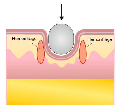 由于圆柱形棍棒表面是圆弧形,打击在人体上仅有部分接触,且各部位的压强也不同,因而形成的损伤有其特征性。常见的是长条状皮内、皮下出血,中心部位较重,向两侧逐渐减轻,边界不清,出血带宽度较棍棒直径小。