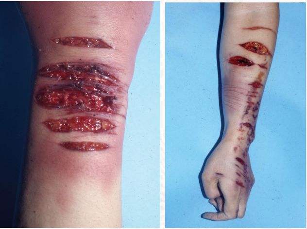 意外切创虽时有发生,但通常不需法医学鉴定。有的自伤(造作伤)者,为了个人的某种目的,在自己身上致伤,谎称被人砍伤或切伤。多数自伤者的切创较轻,数目较少,多位于四肢或腹部不能致命的部位。但有的自伤者为了伪装得逼真,也可能刎颈,但一般颈部切创也较表浅,数目少。