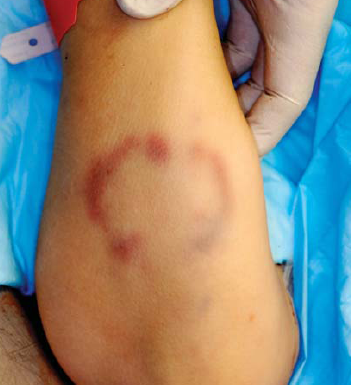 2、膝部致伤:膝部顶撞多伤及会阴部或腹部,可形成类圆形皮下出血,但更常见的是受伤局部并无外伤征象。顶撞胸部可致肋骨骨折;作用于腹部可致腹腔内脏器官破裂;作用于会阴部可能造成疼痛性休克、死亡。有一案例,罪犯以左上肢抱住被害人头部,用右膝顶撞会阴部,致被害人很快死亡。尸检见阴囊皮肤挫伤并伴有阴囊积血,系因会阴部受损伤致疼痛性和神经反射性休克死亡。
