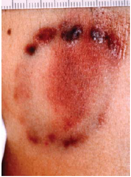 4、拳击伤(punching):是指紧握的拳头打击人体造成的损伤。拳击时常以食、中、环、小指的第一指骨和掌指关节的背侧作为打击面,作用力较集中。其损伤程度取决于打击时的拳速、体力及受害人身体状况和受伤部位。站立体位时,多伤及头面部、颈部、胸腹部、腰背部及双上肢。由于拳头为不规则形状,体表常见不规则形擦伤、皮内出血和皮下出血。