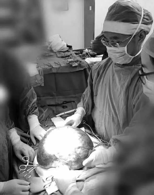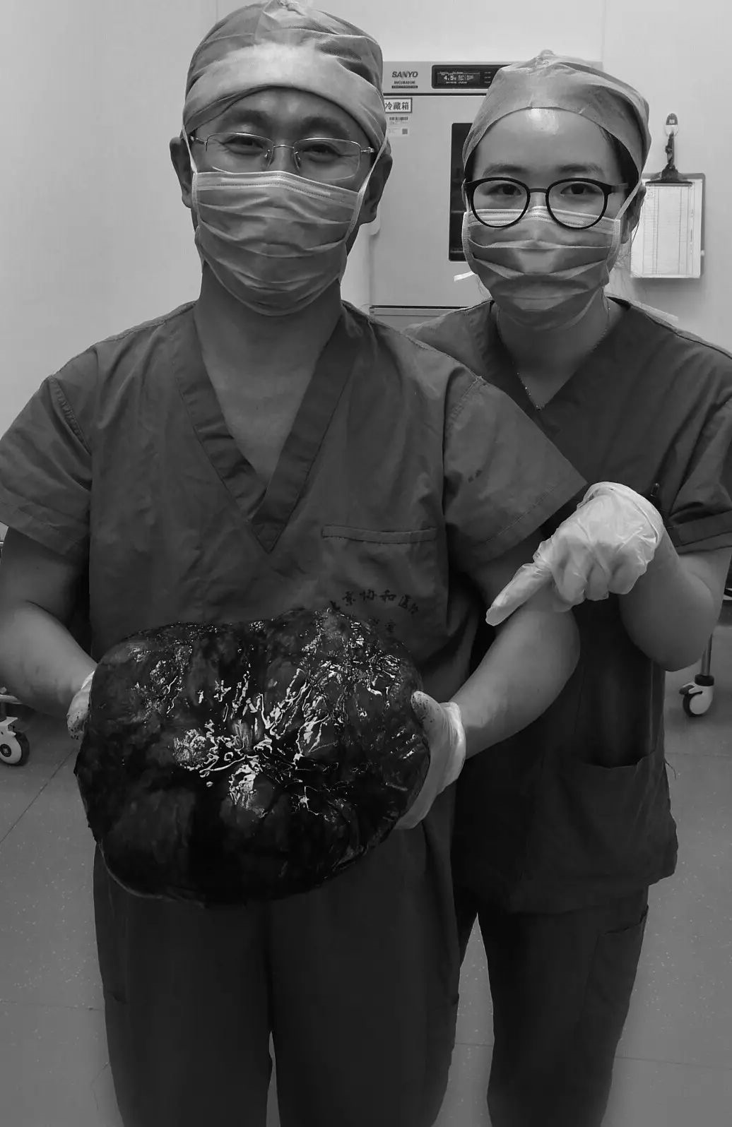 手术记录中关于肿瘤切除过程的描述不足100字,实际上手术可以用“惨烈”来形容,切除的瘤子可以用“壮观”来描述。