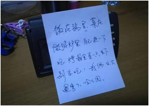 忙完后回到家,已经晚上7点多,敲门无人应答。开门后我看见闹钟上别了一张小纸条,上面写着:饭在锅里,菜在微波炉里,自己热一下吃。烤箱里有一只虾,别忘吃!我俩出去遛弯了,一会儿回。
