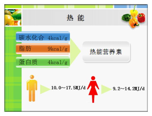 热能 热能不是营养素,但人的生命活动需要消耗能量。热能主要来自于三大营养素—碳水化合物、脂肪、蛋白质,这三种物质被摄入人体后,经过氧化分解,将食物的化学能转变为热能释放出来,供机体使用,因此这三种营养素被称为“产热营养素”。热能的单位通常以焦耳(J)表示,三大营养素产热量为:碳水化合物17kJ/g,脂肪38kJ/g,蛋白质17kJ/g。